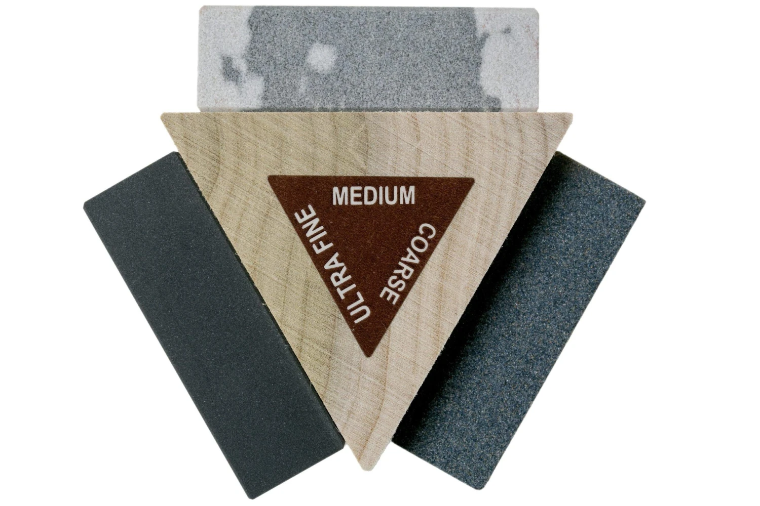 Das Case Tri-Hone Schleifsystem, 09399 ist ein einfaches und vollständiges Schleifsystem. Die drei Seiten haben jeweils eine unterschiedliche Körnung, sodass Du für jedes Messer den richtigen Schleifstein zur Verfügung hast. So kannst Du ein komplett stumpfes oder auch ein noch relativ scharfes Messer schärfen. Du kannst die Schleifsteine drehen und wieder so in den Holzsockel einsetzen, dass der gewünschte Schleifstein nach oben gerichtet ist. Im Lieferumfang sind auch eine Flasche mit Schleiföl (30 ml) und ein Winkelführer für einen Schleifwinkel von 23 Grad enthalten.