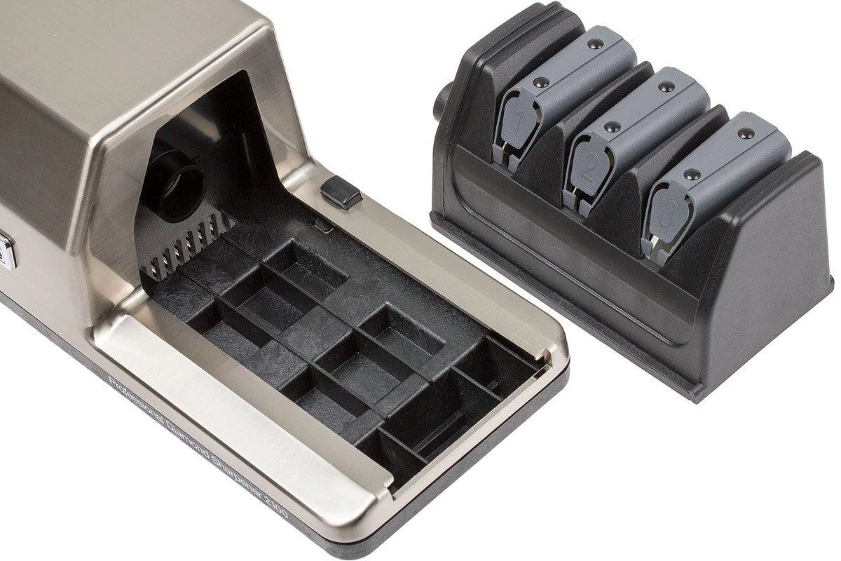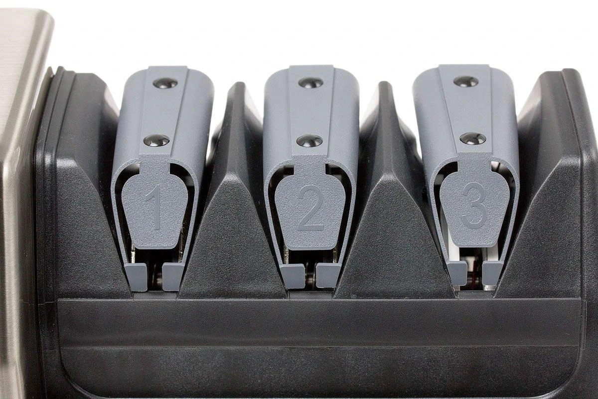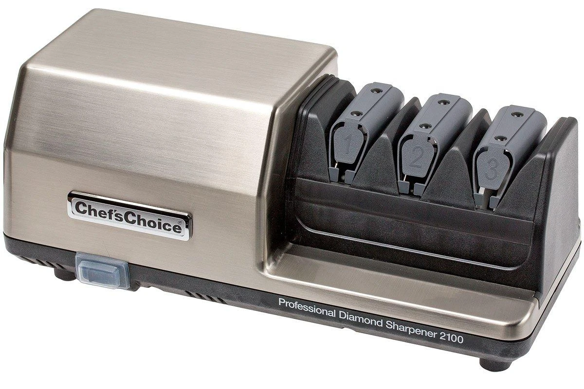 Der Chef’s Choice C2100 ist ein professioneller Messerschärfer, der extra für Großküchen und das Gastgewerbe entwickelt wurde. Dieser ergonomische Messerschärfer bietet ein schnelles 3-Phasen-System mit rasiermesserscharfen Ergebnissen. So musst Du Deine Messer nicht mehr zum Schleifen weggeben. Die Form der Schneide wird in einer leichten Wölbung zur Spitze hin geschliffen. Das Ergebnis ist eine starke und beständige Schneide, die ihre Schärfe sehr gut beibehält.