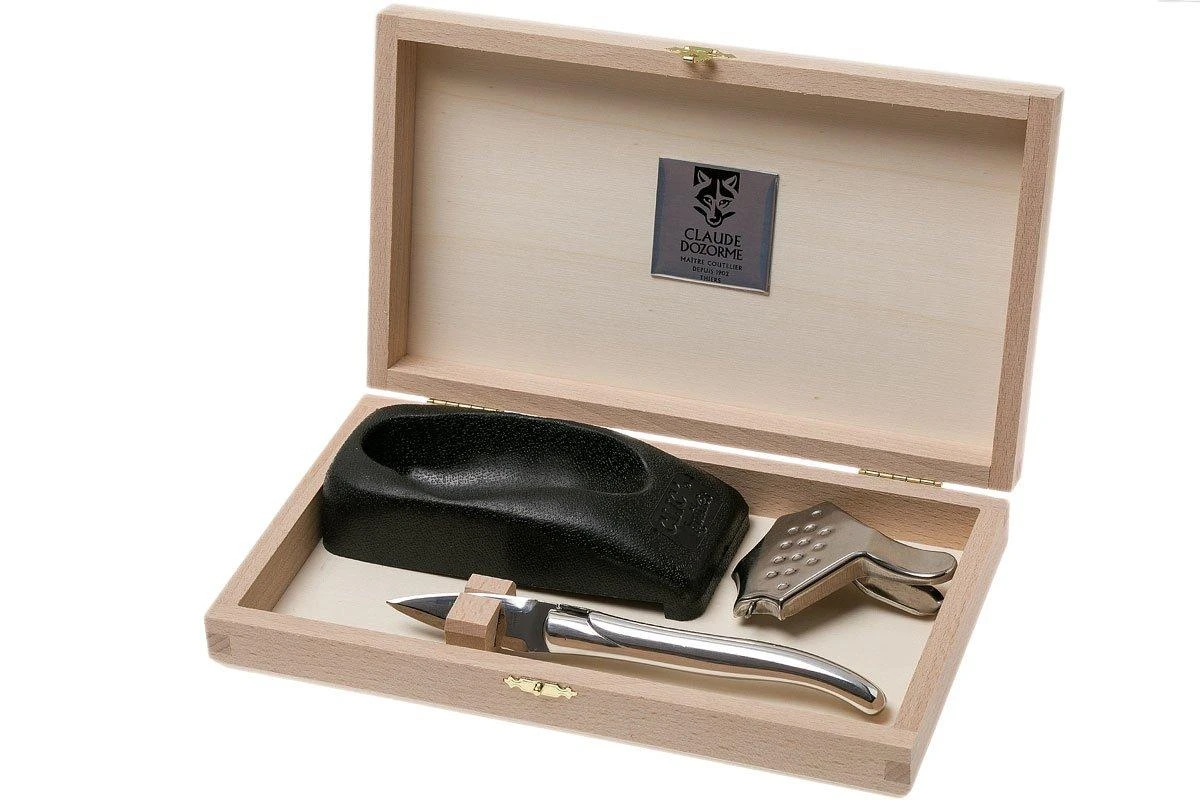 Dieses Claude Dozorme Austern-Set ist die perfekte Basis für eine gelungene Austernparty. Das Set enthält eine solide Unterlage, die die Auster festhält, ein Austernmesser und eine Zitronenpresse für den Zitronensaft.
