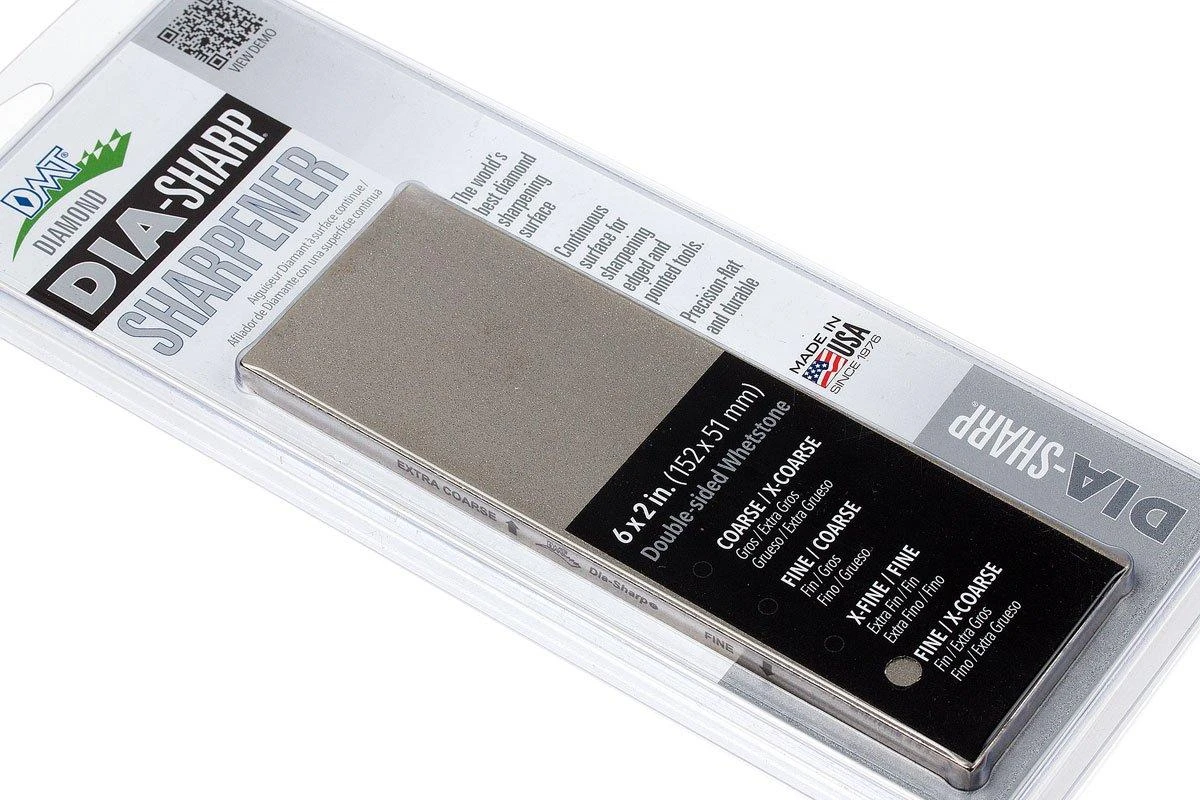 Der DMT DiaSharp Bench Stone 6×2 D6FX Doppelseitig, Fein, Extra Grob ist ein kompakter Schleifstein. Dank einer feinen und einer extragroben Seite kannst Du den Stein für verschiedene Schleifzwecke verwenden. Diamantschleifsteine schärfen schnell und je nach Körnung auch sehr scharf. Ein großer Vorteil beim Schleifen auf einem Diamantschleifstein ist, dass er nicht geglättet werden muss. Bei diesem DiaSharp Stein ist der schleifende Diamant auf einer dicken Stahlplatte von 6 mm aufgebracht. Dies garantiert die Planheit des Schleifsteins.