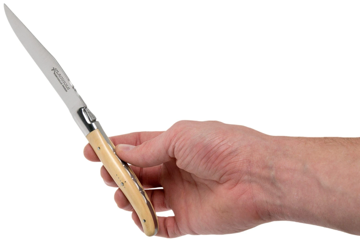Das Fontenille Pataud-Steakmesserset besteht aus zwei Laguiole-Messern mit einem Griff aus französischem Buchsbaumholz. Dies ist ein helles Holz mit einer sehr feinen Struktur. Buchsbaum ist nur in kleinen Mengen und Formaten erhältlich, was es zu einem teuren Holz macht. Das traditionelle „Hirtenkreuz“ im Griff ist gut zu sehen. Das Kreuz, das aus Drahtstiften besteht, verweist auf die Legende der katholischen Hirten, die auf ihren Wanderungen nach Spanien, weit weg von einer Kapelle oder Kirche, beten wollten. So diente das Kreuz den Hirten als kleiner Altar.