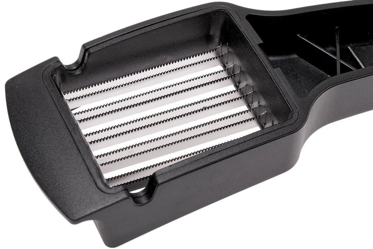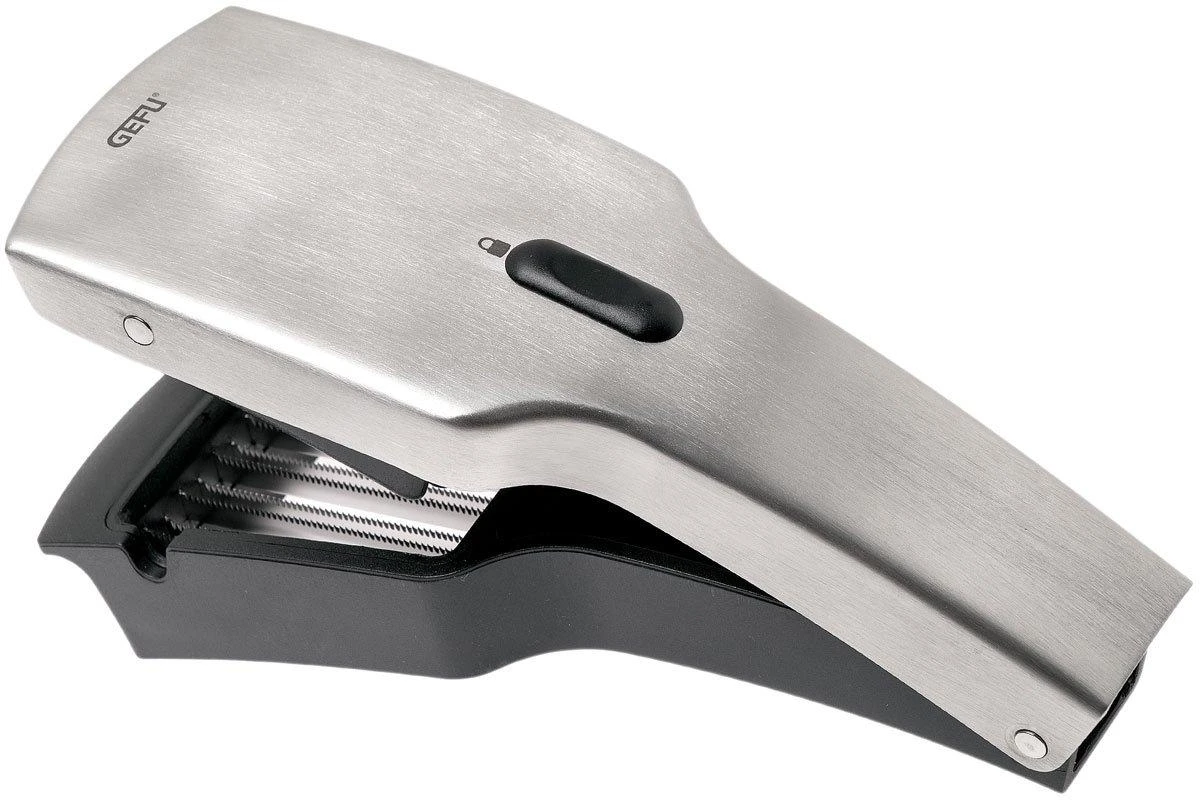 Noch einfacher und schneller geht das Schneiden mit dem GEFU Tari. Dieser schneidet 5 mm dünne Streifen. Es lässt sich damit also schnell und sparsam arbeiten. Er ist für weiches Obst und Gemüse, wie Erdbeeren, Weintrauben, Kiwi, aber auch für Eier und Mozzarella geeignet. Nicht geeignet ist er allerdings für ungekochte Kartoffeln, Zwiebeln, Karotten und andere harte Produkte. Die japanischen Wellenschliffmesser sind scharf, robust und aus rostfreiem Stahl gefertigt. Ein weiterer Vorteil: Durch den praktischen Verriegelungsmechanismus kannst Du dieses Gerät kompakt und sicher aufbewahren. Baue vor der Reinigung das Gerät auseinander und reinige es von Hand oder in der Spülmaschine.