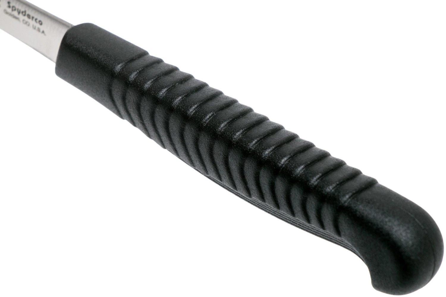 Das kleine Tourniermesser K09PBK von Spyderco hilft Dir mit seiner geschwungenen Klinge bei allen Schälaufgaben und kleineren Schneidearbeiten in der Küche. Die dünn geschliffene Klinge macht das Messer sehr geeignet für präzise Arbeiten. Zum Beispiel kannst Du mit ihm dünne Scheiben schneiden oder einen Apfel schälen. Dank der Spitze kannst Du runde Produkte perfekt in Form bringen.