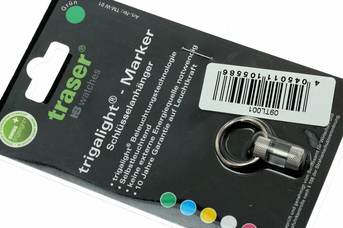 Dieser kleine Schlüsselanhänger gibt gerade so viel Licht, um Ihren Schlüsselbund (oder ein anderes Objekt) in der Dunkelheit wiederzufinden. Das Gute ist dabei, dass diese Minilampe keine Batterien benötigt und auch nicht „aufgeladen“ werden muss, indem man sie gegen das Licht hält. Die Lampe funktioniert durch eine sehr winzige Menge Tritium, einem Wasserstoffisotop, das ganz leicht radioaktiv ist (absolut ungefährlich!). Während des radioaktiven Zerfalls wird eine ionisierende Strahlung freigesetzt, die zur Lichtbildung verwendet wird. Diese Technik wird auch in einigen sehr exklusiven Armbanduhren eingesetzt. Die Lichtmenge des Traser lässt sich hiermit in etwa vergleichen.