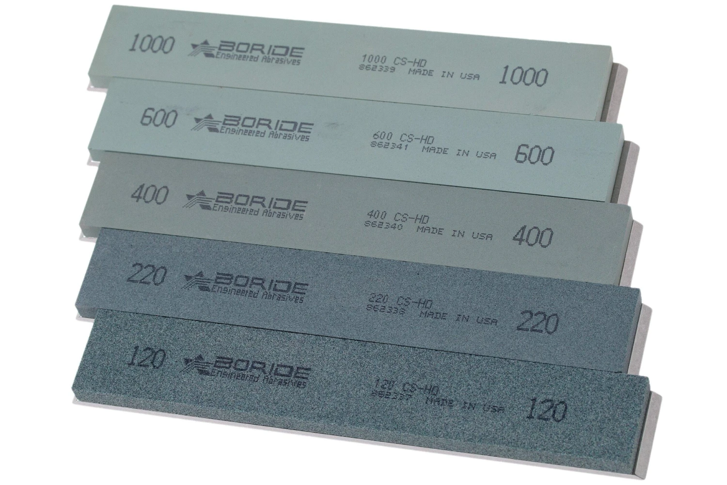 Das TSPROF Boride CS-HD 5-teilige Schleifsteinset enthält fünf Schleifsteine aus Siliziumkarbid auf Aluminiumplatten. Siliziumkarbid ist ein sehr hartes Schleifmaterial, das mühelos Messer mit einer Härte von bis zu 63 HRC schärfen kann. Selbst die härtesten japanischen Küchenmesser sind diesen Schleifsteinen nicht gewachsen. Im Vergleich zu Aluminiumoxid hat Siliziumkarbid schärfere und dünnere Schleifpartikel. Das Ergebnis sind weniger breite Kratzer und ein schöner seidiger Glanz auf der Schneide Deines Messers durch die höhere Körnung.