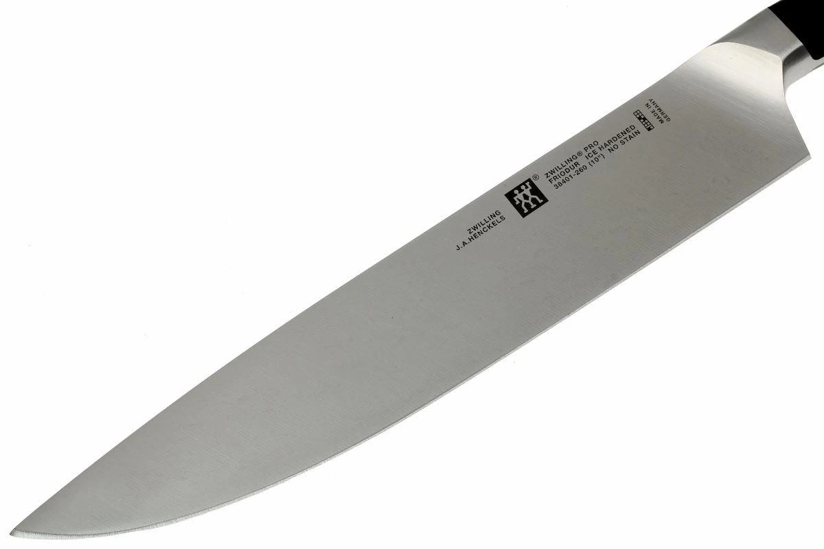 Die Küchenmesser der Pro-Serie von Zwilling haben eine Klinge, die aus einem einzigen Stück Stahl geschmiedet ist. Die Klinge läuft vollständig durch den Kunststoff-Griff, es ist also „full tang“. Der Griff ist mit drei Nieten am Stahl befestigt. Der Übergang ist nahtlos. Es kann kein Schmutz dazwischen gelangen. Die Messer haben ein klassisches Design und sind perfekt für Menschen, die schwerere Messer bevorzugen.